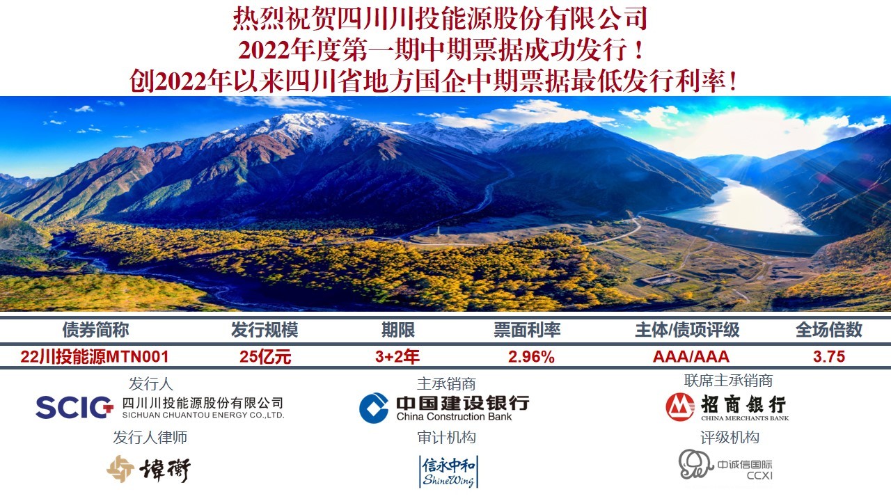 川投能源成功發(fā)行25億元中期票據(jù)創(chuàng)2022年以來四川省地方國企中期票據(jù)最低發(fā)行利率