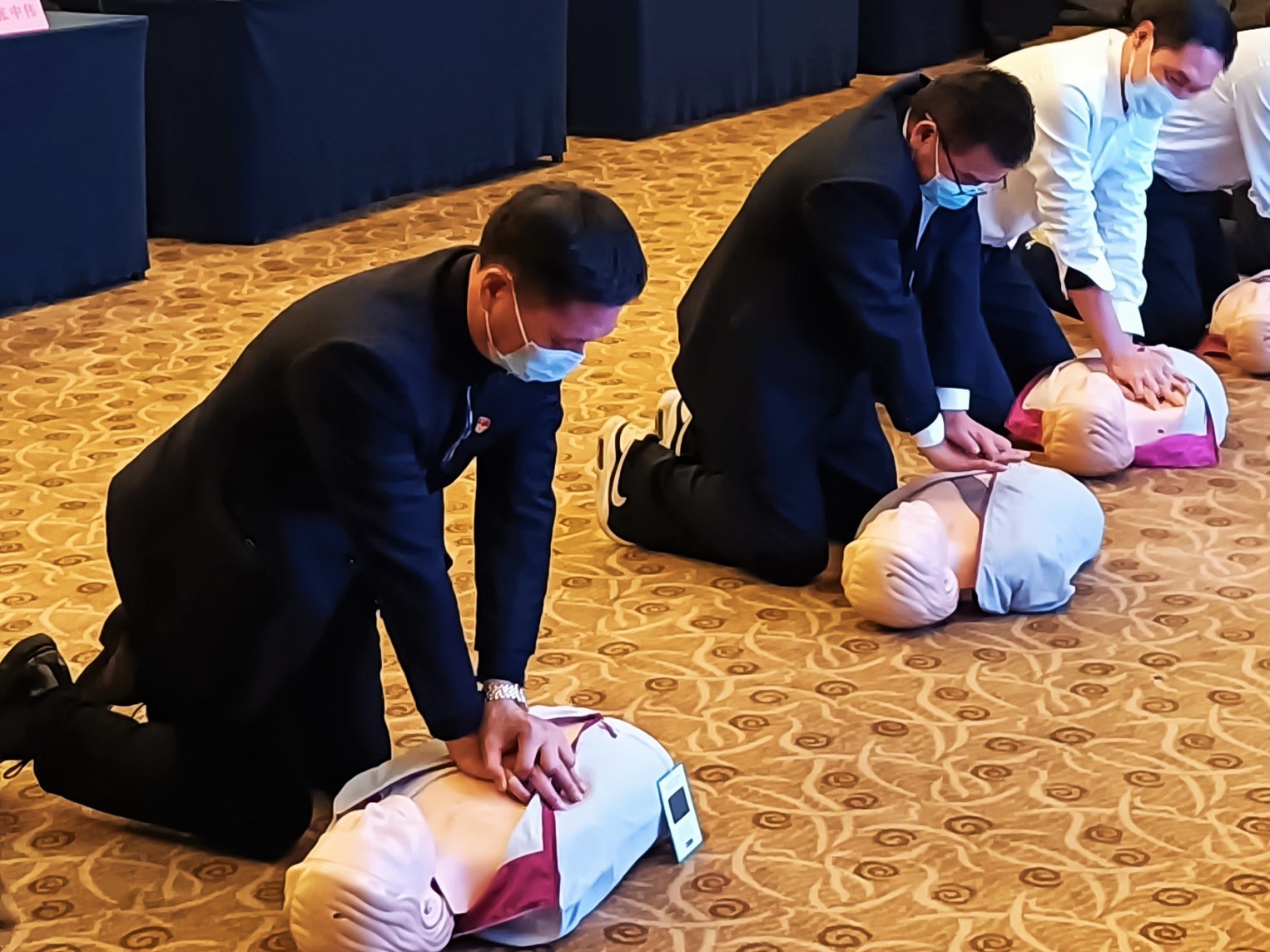 學以致用,鞏固認知。通過培訓講師的引導,在場員工順利實現(xiàn)應急救護理論與技能實操的聯(lián)動。強運動量的力竭、十指緊扣的脹痛絲毫未能阻擋全員積極參與心肺復蘇術(shù)實操。跟隨節(jié)拍器的按壓節(jié)奏,從伊始的“眼神聚焦位置錯誤”、“手臂發(fā)力部位不當”、“未使人體模具腹部有效隆起”到滿分學員大量涌現(xiàn),實踐熱情度不斷高漲,技能掌握度顯著提升,為“危難時刻,我有準備”奠基。