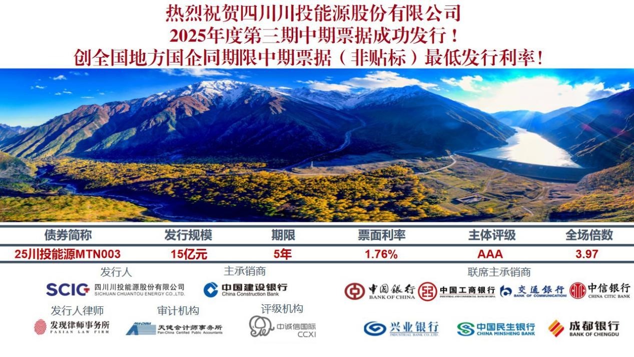 6月24日,川投能源搶抓資本市場(chǎng)有利時(shí)間窗口,成功發(fā)行2025年度第三期中期票據(jù)。本期中期票據(jù)發(fā)行規(guī)模為15億元,發(fā)行期限5年,發(fā)行利率1.76%,創(chuàng)全國(guó)地方國(guó)企同期限中期票據(jù)(非貼標(biāo))最低發(fā)行利率,同時(shí)也創(chuàng)公司中長(zhǎng)期債券歷史最低發(fā)行利率。
