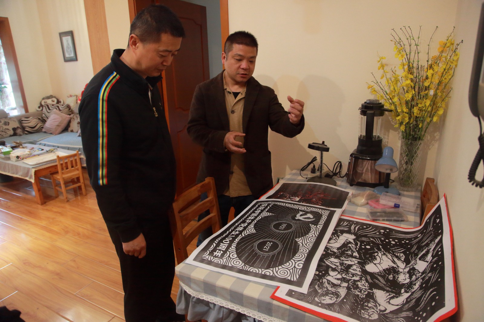 楊超龍?jiān)敿?xì)詢問了剪紙創(chuàng)作的工期安排、當(dāng)前進(jìn)展,共同探討了作品創(chuàng)作構(gòu)思、整體構(gòu)圖、內(nèi)涵要義和各種藝術(shù)表現(xiàn)手法的選擇,并參觀了莊叢燦歷年的剪紙作品及創(chuàng)作工具。并向莊叢燦及其團(tuán)隊(duì)指出,要以黨史學(xué)習(xí)教育為契機(jī),認(rèn)真梳理、統(tǒng)籌謀劃、精心設(shè)計(jì)、用心創(chuàng)作好主題作品,通過完整的構(gòu)架、巧妙的構(gòu)思、精美的構(gòu)圖展現(xiàn)黨的百年光輝歷程,歌頌黨的百年豐功偉績。楊超龍鼓勵(lì)莊叢燦要在創(chuàng)作中傳承發(fā)揚(yáng)黨的光榮傳統(tǒng)和優(yōu)良作風(fēng),精誠團(tuán)結(jié)、艱苦奮斗、攻堅(jiān)克難,以剪紙藝術(shù)凸顯川投能源的特色和亮點(diǎn),獻(xiàn)禮建黨100周年。