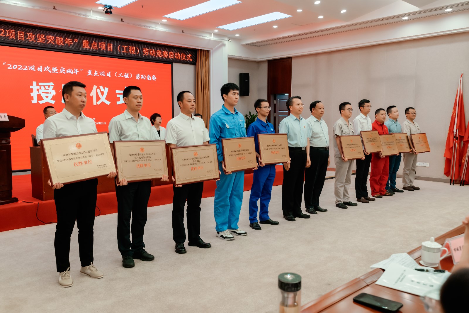 啟動儀式上,市總工會授予金沙江銀江水電站等項目(工程)為“2021年度攀枝花市重點項目(工程)勞動競賽優(yōu)勝單位”稱號,并為金沙江銀江水電站等“2022項目攻堅突破年”重點項目(工程)授旗,鼓舞大家加速建設(shè)、實現(xiàn)突破、取得實效。