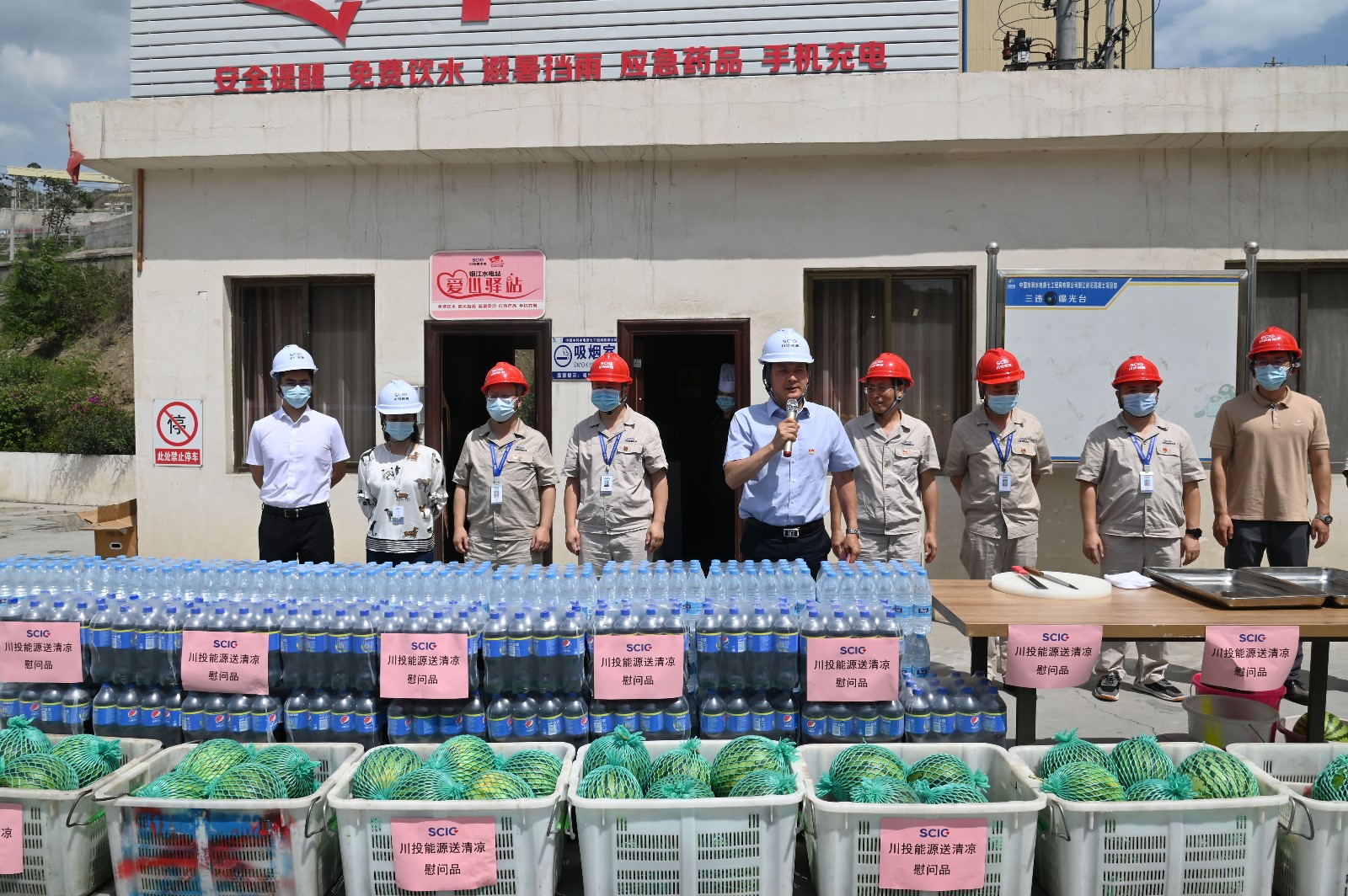 夏至剛過,高溫來襲,攀枝花已進入了高溫酷暑季節(jié)。6月22日下午,為落實全國總工會《關于做好2022年職工防暑降溫工作的通知》要求,受川投能源黨委書記、副董事長、總經理楊洪的委托,川投能源黨委副書記、工會主席冉蘭平一行頂著烈日高溫,專程到銀江水電站工地看望慰問堅守在高溫酷暑中的一線建設者。川投能源人力資源部經理王歆、紀檢工作部陳一鳴及攀水電公司領導、志愿者服務隊參加慰問。
