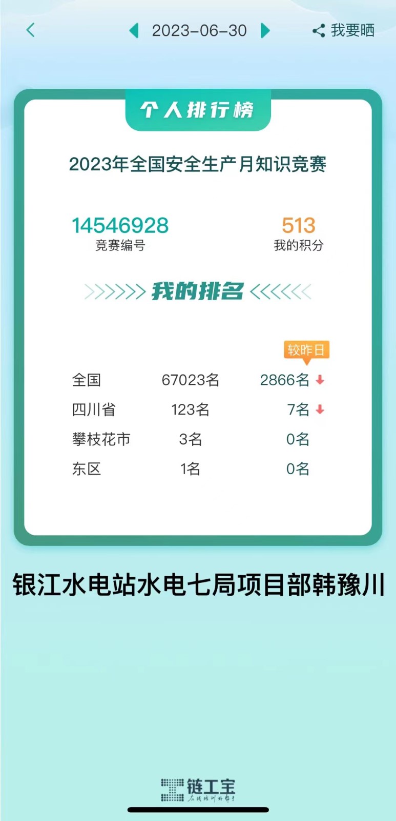 在“鏈工寶”2023年全國安全生產(chǎn)月知識(shí)競(jìng)賽活動(dòng)中,攀枝花市前10名中,銀江水電站占3人,東區(qū)前10名中,銀江水電站占6人,有效檢驗(yàn)了安全生產(chǎn)月活動(dòng)成果,充分體現(xiàn)了銀江水電站學(xué)安全、講安全的濃厚安全生產(chǎn)氛圍,進(jìn)一步強(qiáng)化了廣大工程參建人員的安全生產(chǎn)意識(shí)。