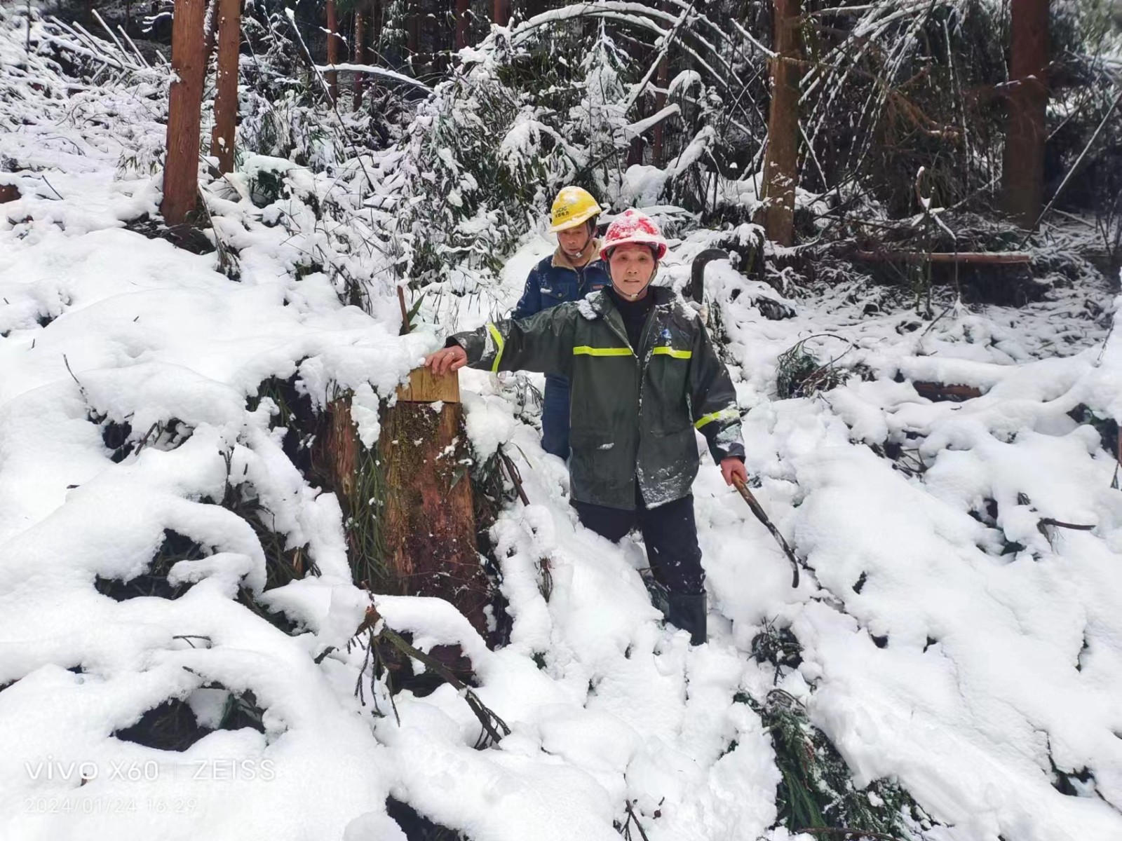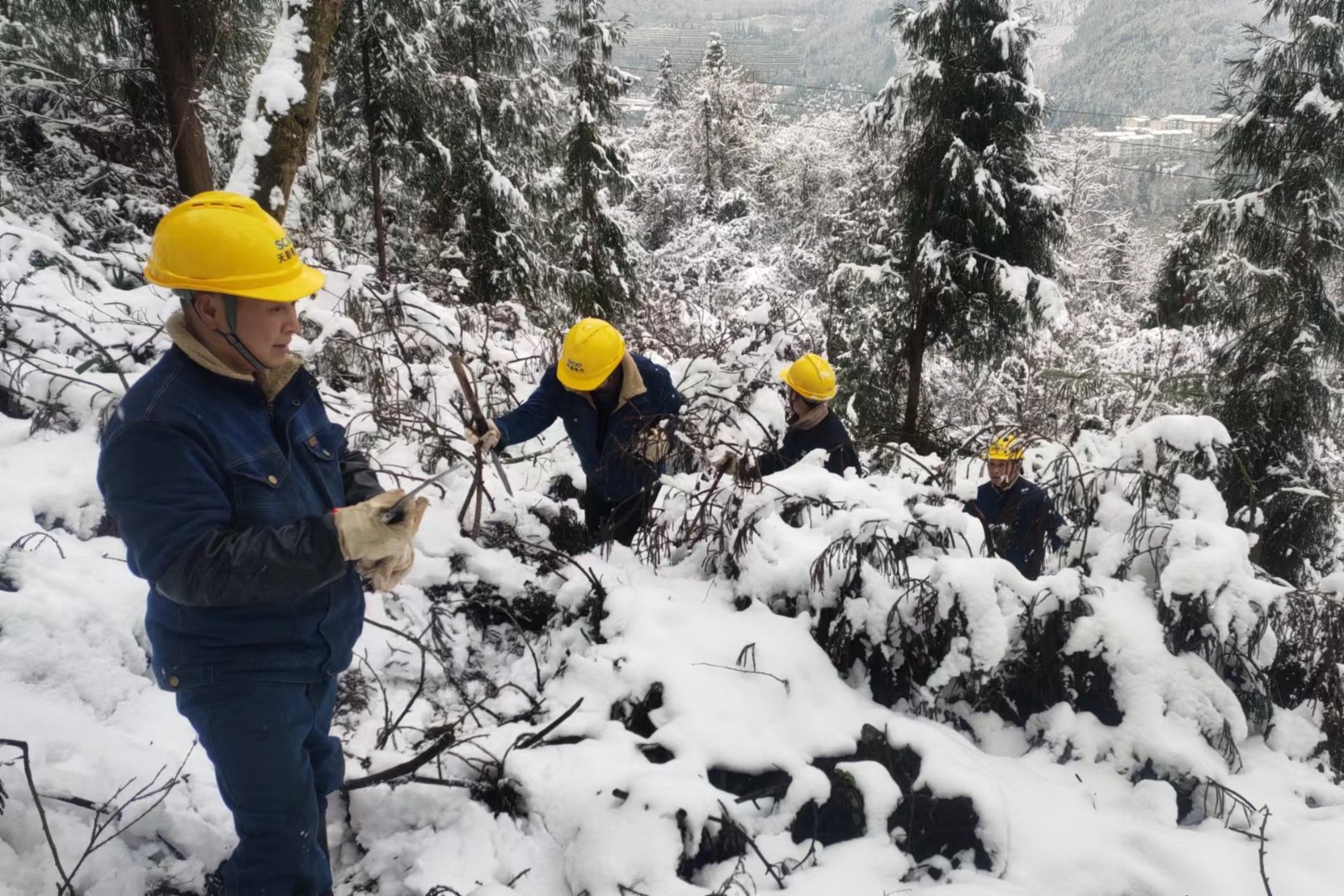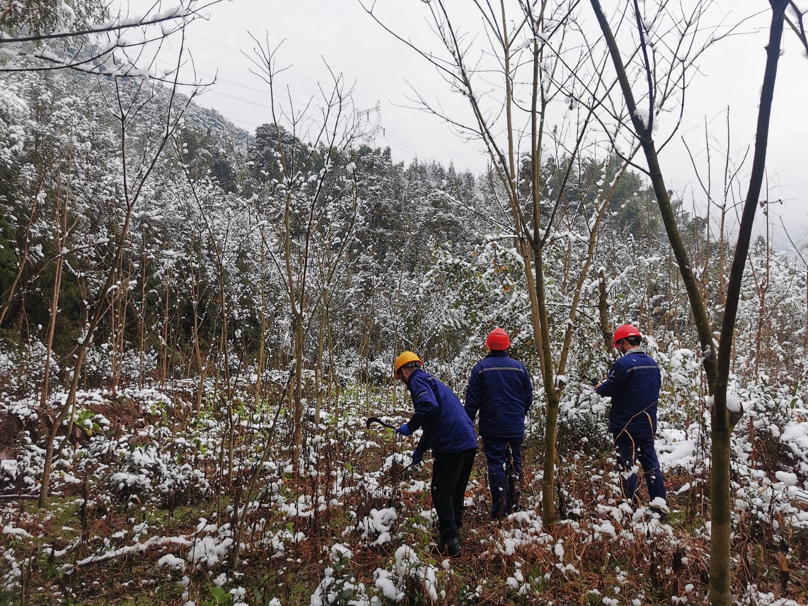 1月23日,天彭電力制定詳細(xì)的樹(shù)障清理計(jì)劃。巡線員手持砍刀,翻山越嶺,負(fù)重前行,踩著嘎吱作響的積雪,迎著刀割般的寒風(fēng),迅速開(kāi)始對(duì)110kV鳳回線、10kV沙橋線、鳳通線等線路設(shè)備進(jìn)行巡查,對(duì)倒伏在線路的竹樹(shù)進(jìn)行“圍剿”,共清理樹(shù)枝、竹子共110余棵,現(xiàn)場(chǎng)巡線員盡管臉凍得通紅、手凍得僵硬、腳凍得麻木,仍有條不紊地開(kāi)展工作,經(jīng)過(guò)一天的辛勤巡檢,線路和設(shè)備均運(yùn)行正常。