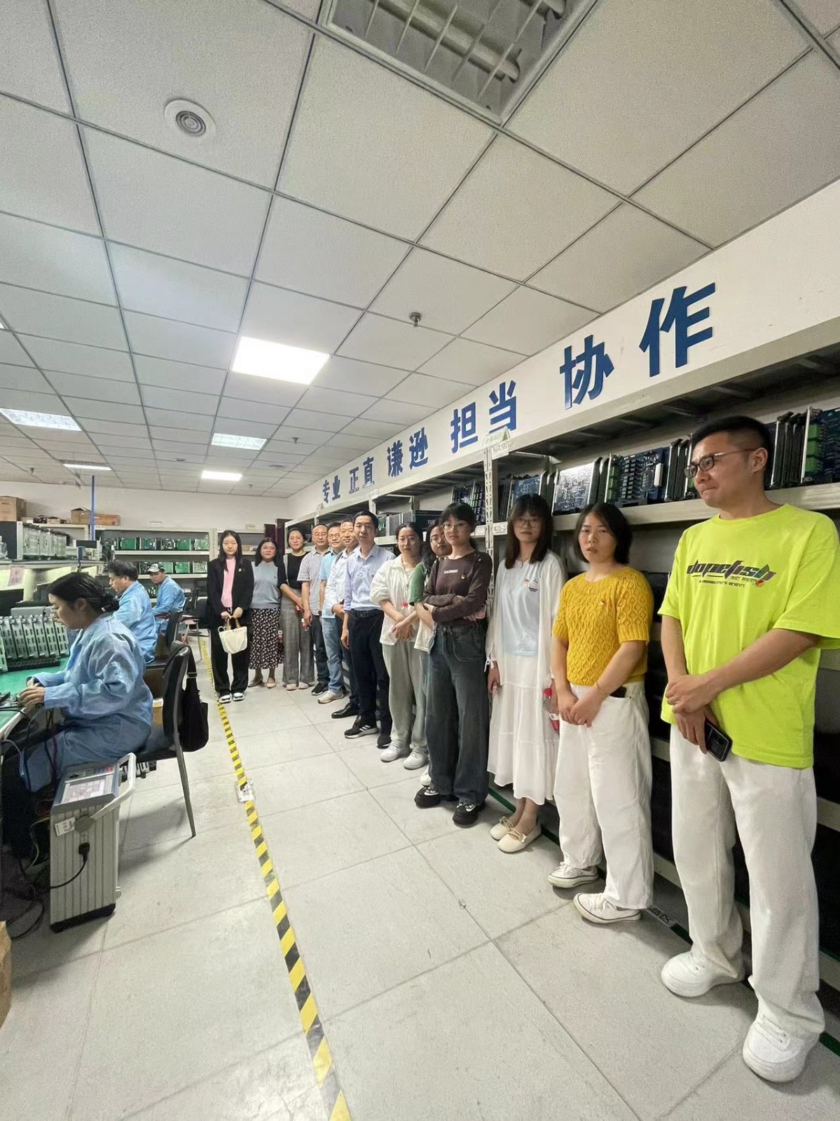 隨后,邀請生產(chǎn)車間主任夏佐平向大家介紹公司產(chǎn)品的生產(chǎn)過程,全體黨員到模板調(diào)試、裝置裝配、總裝車間現(xiàn)場實地參觀,通過交流,詳細了解在生產(chǎn)調(diào)試中需要注意的細節(jié),身臨其境深化對產(chǎn)品生產(chǎn)過程、質(zhì)量控制的認識。