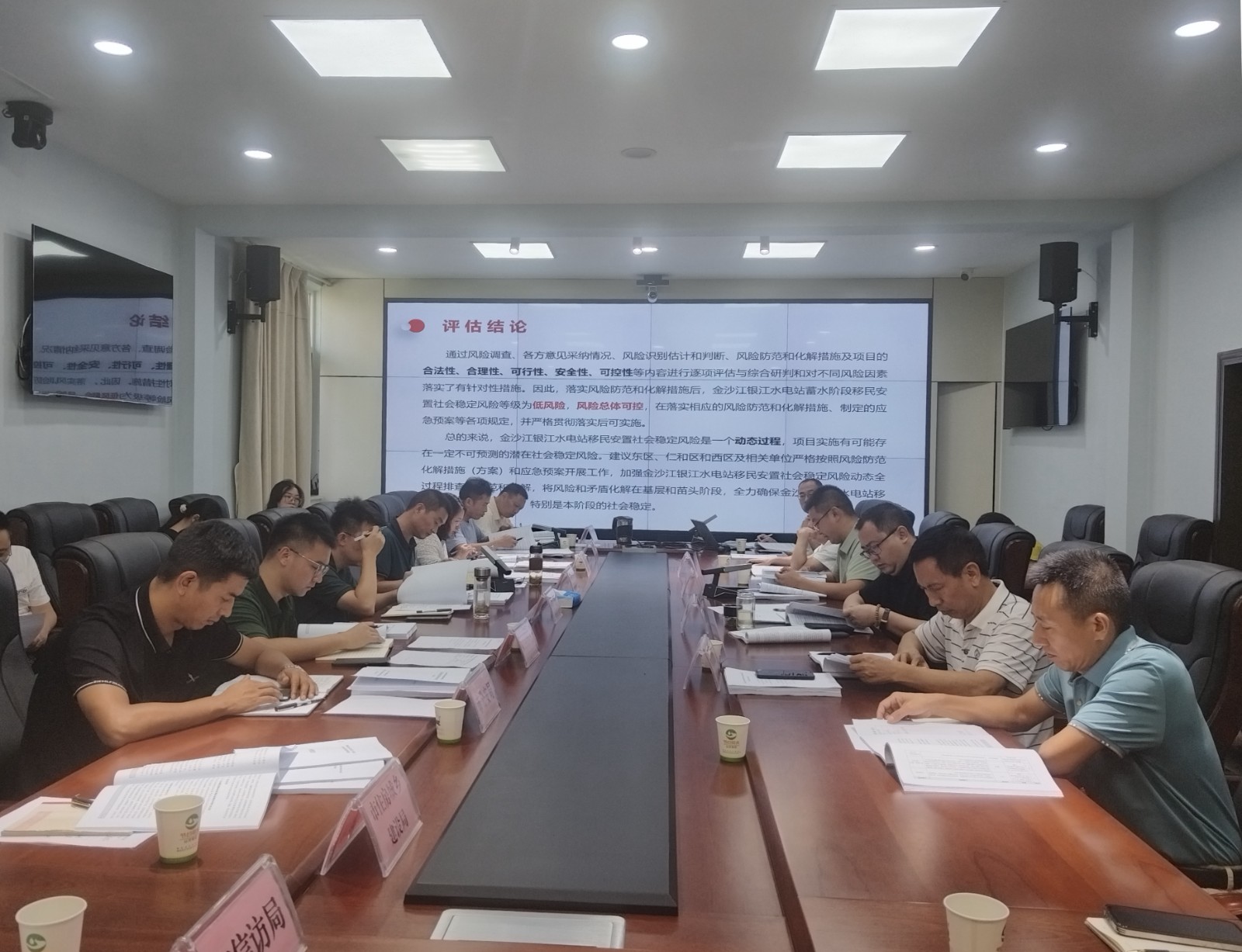 會議首先由設計單位對銀江水電站工程蓄水階段移民安置社會穩(wěn)定風險評估報告成果進行匯報,與會人員進行了充分討論,在社會穩(wěn)定風險識別、風險防范和化解措施等方面提出了修改意見及建議。會議認為,該報告內(nèi)容符合實際情況,達到《四川省社會穩(wěn)定風險評估辦法》要求,金沙江銀江水電站工程蓄水階段移民安置社會穩(wěn)定風險等級為低風險,風險總體可控。會議要求相關部門要持續(xù)抓好風險防范工作及化解措施的執(zhí)行,確保不發(fā)生水利水電工程移民群體事件,為下一步銀江水電站工程蓄水移民安置驗收打牢基礎。