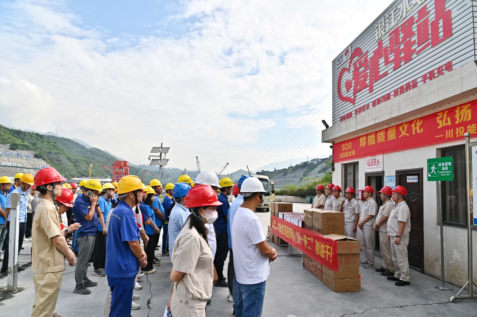 9月17日,正值萬家團(tuán)圓的中秋佳節(jié),而銀江水電站工地依舊機(jī)器轟鳴,一派熱火朝天的繁忙景象。川投能源副總經(jīng)理、攀水電公司黨總支書記、董事長徐孝剛帶領(lǐng)攀水電公司領(lǐng)導(dǎo)班子全體成員來到愛心驛站,為1200余名建設(shè)者送上香甜的月餅和清香的涼茶,向他們表達(dá)深切慰問與崇高敬意。