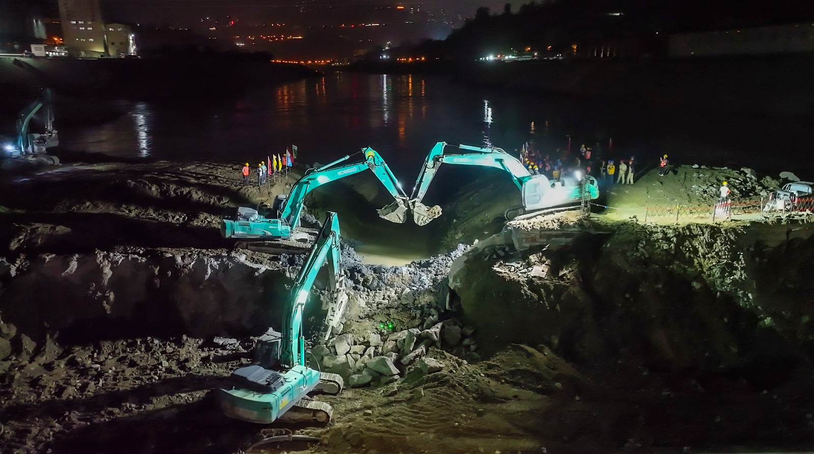 金秋十月,川投能源銀江水電站工程建設(shè)“進(jìn)度條”持續(xù)刷新。10月25日晚上,隨著川投能源副總經(jīng)理、導(dǎo)流明渠截流指揮長徐孝剛一聲令下,十余臺(tái)挖掘機(jī)在二期上游圍堰右岸進(jìn)行破口開挖,奔騰的金沙江水隨即涌入主河床廠房與溢流壩上游,充水平壓后江水經(jīng)溢流壩段流向下游,銀江水電站成功實(shí)現(xiàn)分流。這一重要進(jìn)展為按期完成導(dǎo)流明渠截流打下堅(jiān)實(shí)基礎(chǔ),也標(biāo)志著銀江水電站首臺(tái)機(jī)組投產(chǎn)發(fā)電正式進(jìn)入倒計(jì)時(shí)階段。
