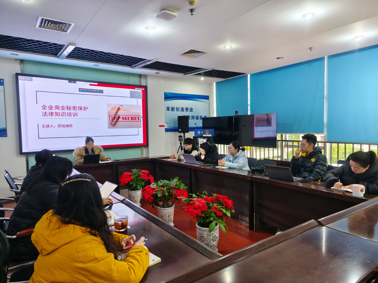 本次培訓邀請公司常年法律顧問律師蘇瑤主講,她首先解讀憲法基本精神和特征,著重強調(diào)了民主、法治、人權(quán)三大核心價值,以及在推動國家治理體系和治理能力現(xiàn)代化方面的重要作用。在商業(yè)秘密保護方面,律師從定義、范圍、保護措施等入手,緊密結(jié)合企業(yè)管理實際特點,通過案例分析商業(yè)秘密泄露的常見途徑和后果,詳細介紹了如何建立完善商業(yè)秘密保護體系。在信息安全方面,律師結(jié)合《中華人民共和國網(wǎng)絡安全法》《中華人民共和國個人信息保護法》等法律法規(guī),從個人信息安全防護意識培養(yǎng)、辦公環(huán)境中信息安全實踐、網(wǎng)絡攻擊防范與應急響應策略、法律法規(guī)遵循與合規(guī)性要求進行解析,對如何提高公司信息安全能力提出專業(yè)意見。