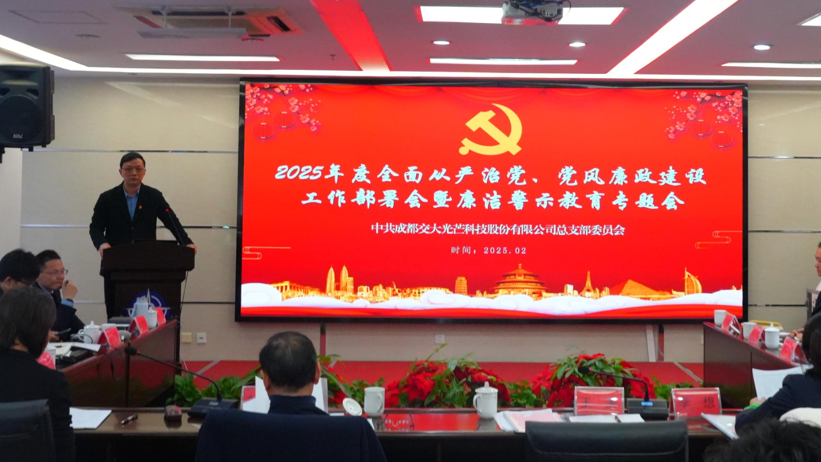 為深入學習貫徹二十屆中紀委四次全會精神,深入推進公司黨風廉政建設和反腐敗工作,2月21日,交大光芒黨總支召開2025年度全面從嚴治黨、黨風廉政建設工作部署會暨廉潔警示教育大會,黨總支書記、常務副總經理王濤主持會議,公司領導班子成員、主管及以上管理人員、黨員參加會議。