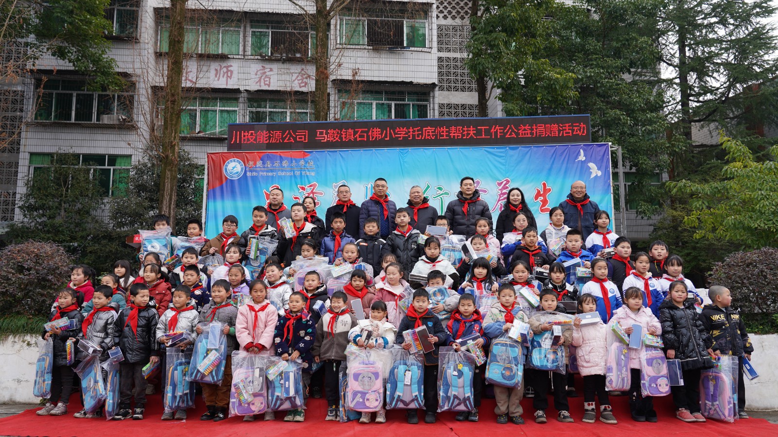 在馬鞍鎮(zhèn)石佛小學(xué),楊洪等領(lǐng)導(dǎo)為貧困學(xué)生送上體育器材、文化用具等學(xué)習(xí)生活用品,勉勵(lì)孩子們要從小樹(shù)立遠(yuǎn)大的志向,勇敢面對(duì)困難,在逆境中堅(jiān)持不懈地奮斗,努力成長(zhǎng)為德才兼?zhèn)涞膬?yōu)秀學(xué)生,以實(shí)際行動(dòng)感恩家庭的養(yǎng)育之恩,回饋社會(huì)的關(guān)愛(ài)之情。