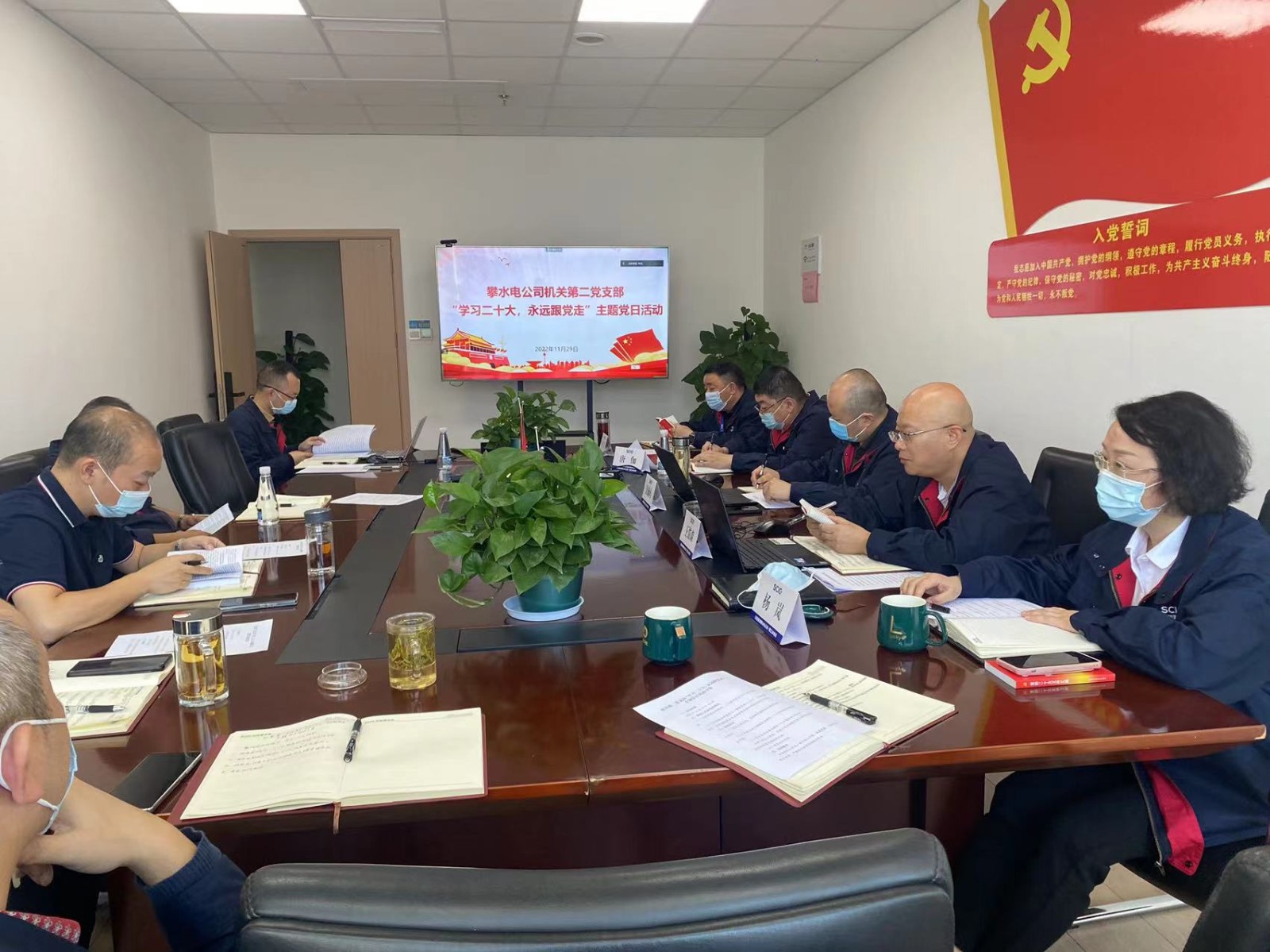 旗幟指引方向,信心凝聚力量。11月29日,攀水電公司機關第二黨支部采取線上與線下相結合的方式組織開展“學習二十大,永遠跟黨走”主題黨日活動,所屬黨員、非黨中干及入黨積極分子20人參加活動,黨總支副書記、總經(jīng)理吳巍嶼等5名領導班子成員、黨總支委員落實“雙重組織生活”要求,以普通黨員身份參加活動。