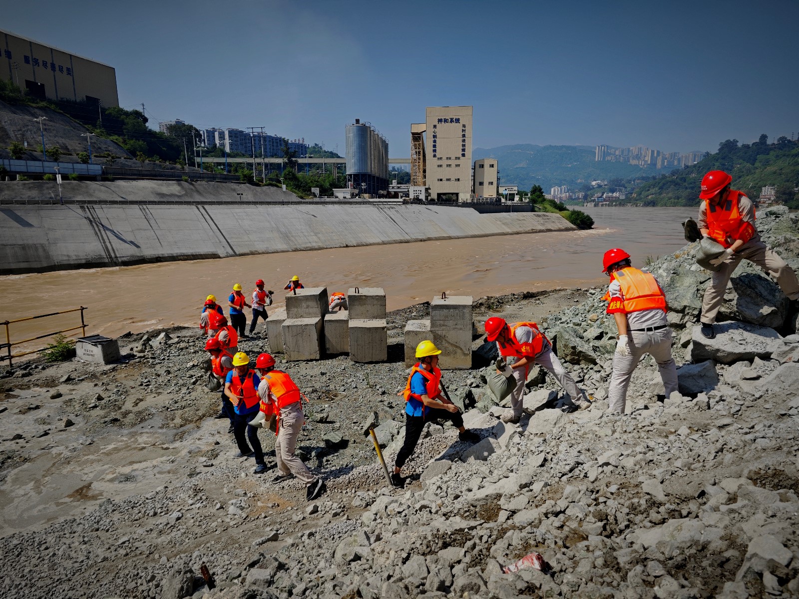 活動中,由公司黨員領(lǐng)導(dǎo)帶頭,分組對導(dǎo)流明渠邊坡、安全體驗(yàn)館、上下游圍堰及基坑、導(dǎo)流明渠進(jìn)出口等部位進(jìn)行了全面詳細(xì)的巡視檢查?;顒舆€對防洪度汛應(yīng)急物資進(jìn)行了補(bǔ)充,有的拿鐵鍬、有的拿編織袋,通過緊密配合,迅速完成幾百個防汛沙袋的裝袋,并排成長隊接力運(yùn)送,將沙袋搬運(yùn)至重點(diǎn)部位整齊堆放。通過半日的緊張勞動,參加人員衣背早已被汗水浸透,但他們沒有絲毫怨言,更是講到這次活動不僅補(bǔ)充了防汛物資,還真正提高了“防大汛、救大災(zāi)、搶大險”的安全意識和應(yīng)急搶險能力,將繼續(xù)堅守工作崗位,以汛為令、聞汛而動,在防洪度汛和應(yīng)急搶險中發(fā)揮先鋒模范作用,保障銀江水電站工程建設(shè)安全順利推進(jìn)。