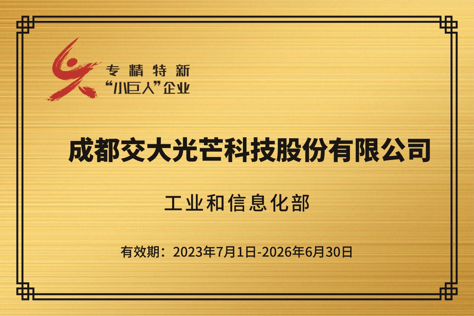 日前,國家工業(yè)和信息化部公布《關(guān)于第五批專精特新“小巨人”企業(yè)和通過復(fù)核的第二批專精特新“小巨人”企業(yè)名單的通告》,成都交大光芒科技股份有限公司被授予專精特新“小巨人”稱號。